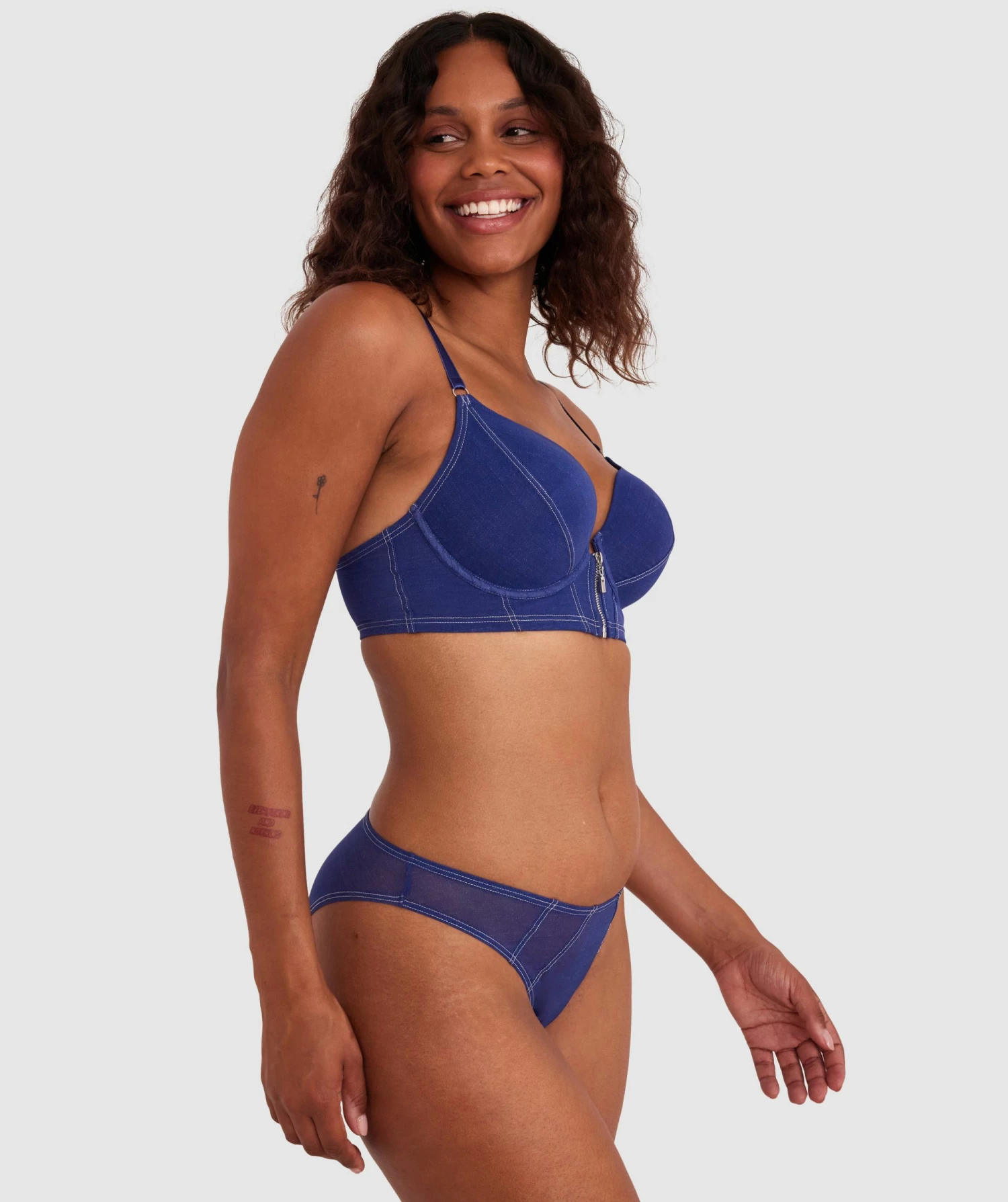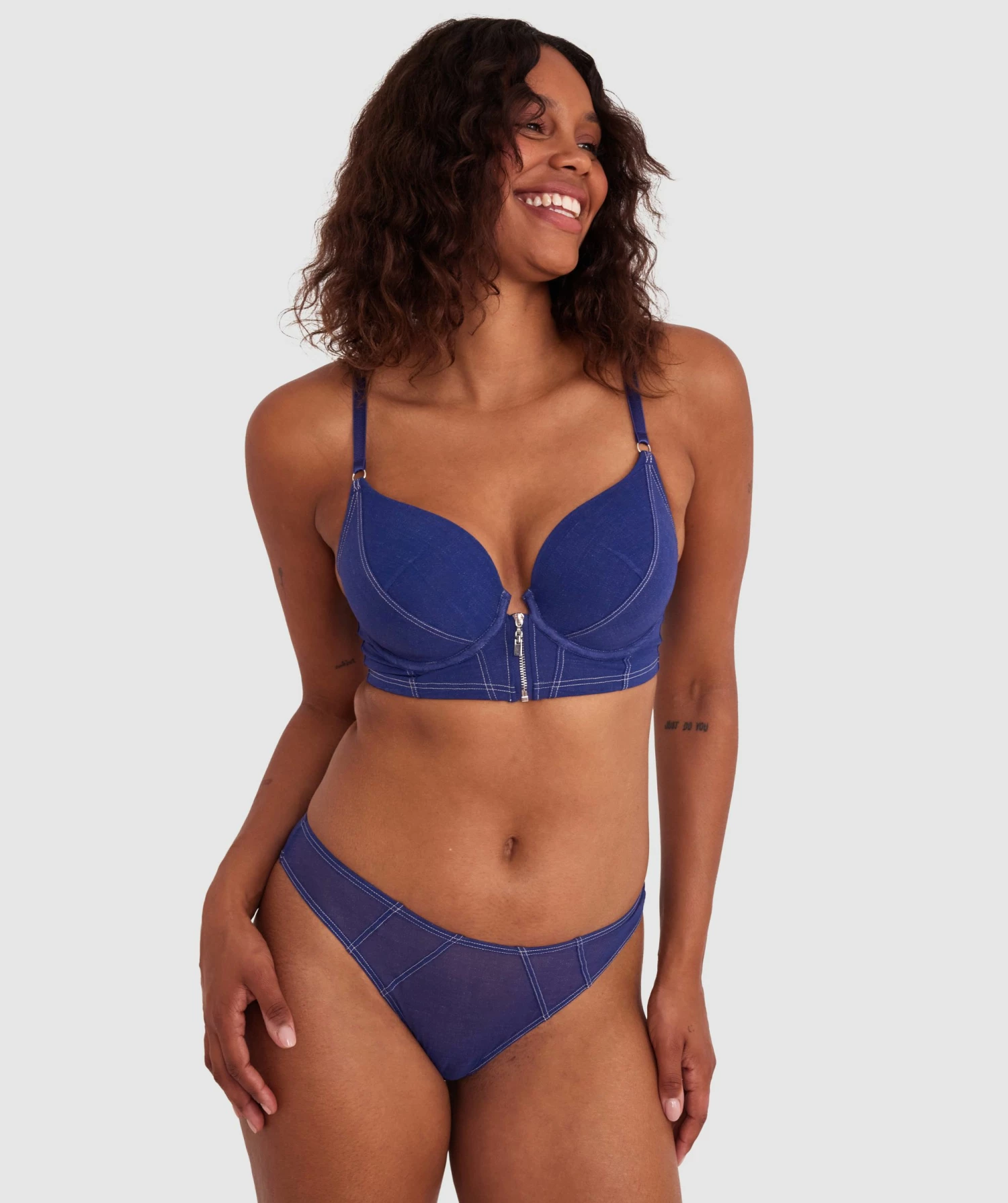 Exude casual chic vibes with our Aaliyah Full Cup in denim-like fabric. This cute mini-bustier lovingly hugs your curves and adds a playful twist with its centre zipper design. Embrace this unique charming choice and make a statement.