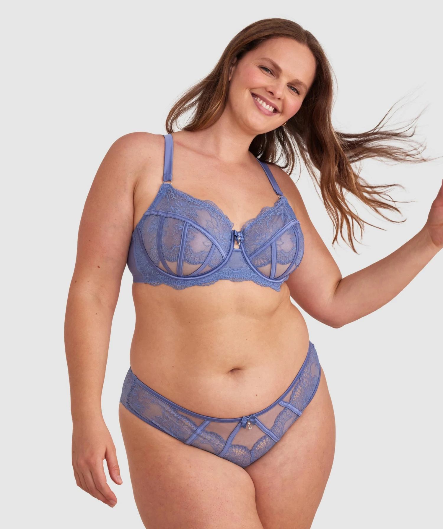 Prepare to captivate hearts and indulge in a world of seductive charm with our Bryanna Brazilian crafted with pretty blue lace and silky satin. The classic cut offers a tantalising reveal, embracing your curves with a flirty and flattering fit.