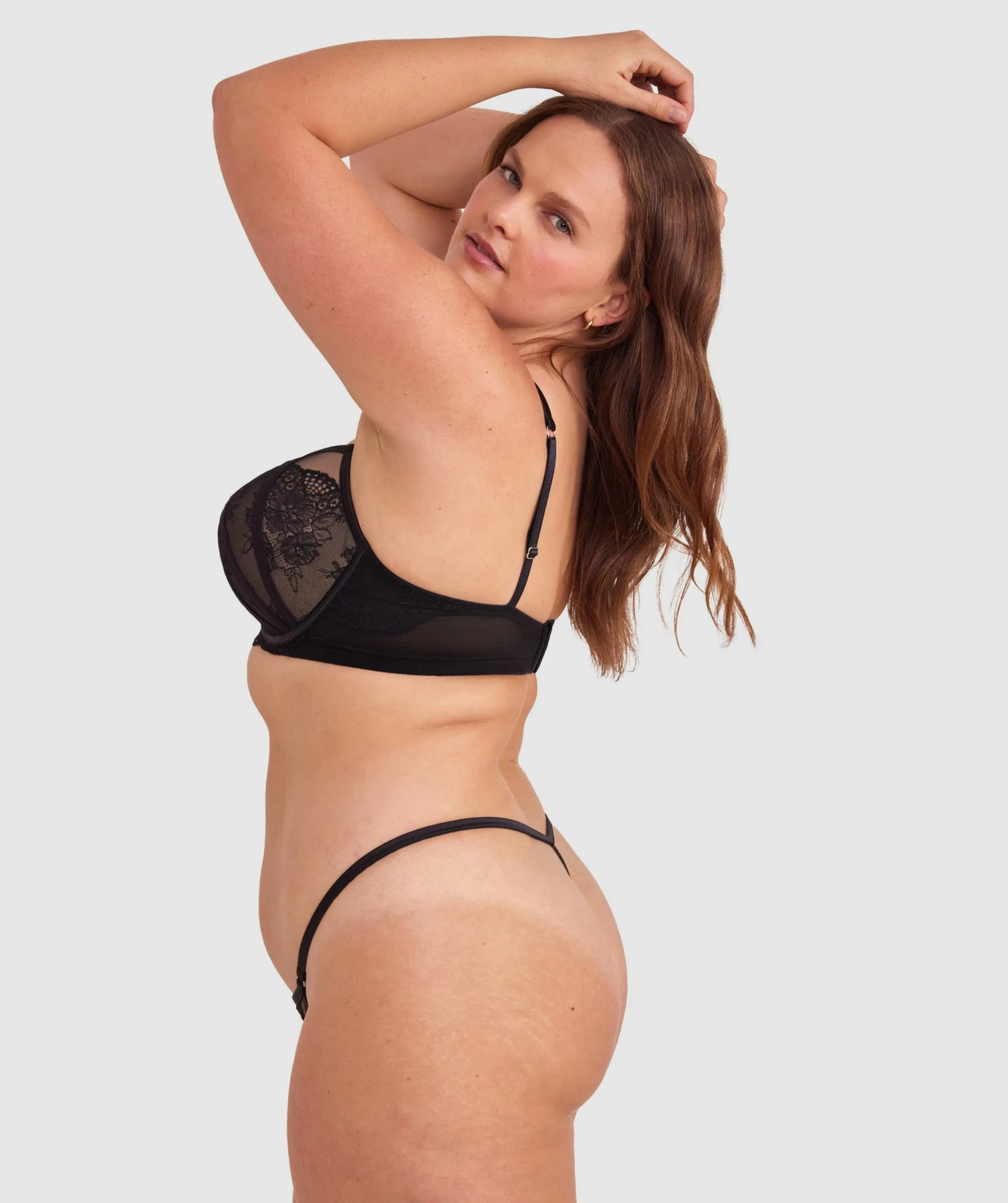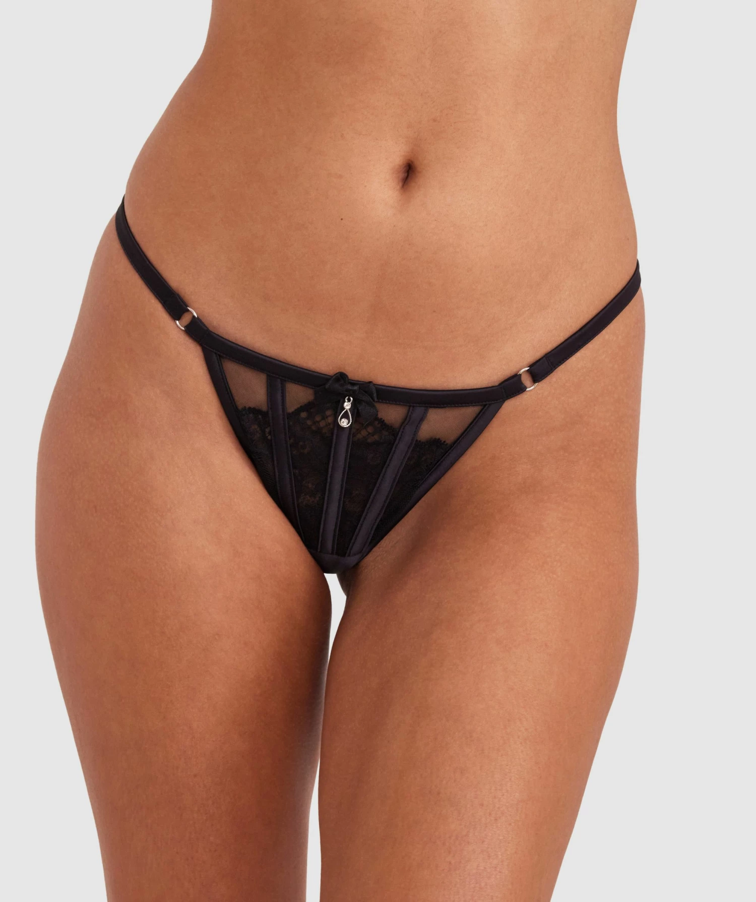Make room for our Bryanna Mini V in alluring black lace. This itty-bitty piece stimulates the senses, leaving you feeling irresistibly flirtatious. The front panel adorned with gem detailing and strappy binds enhance its captivating appeal.