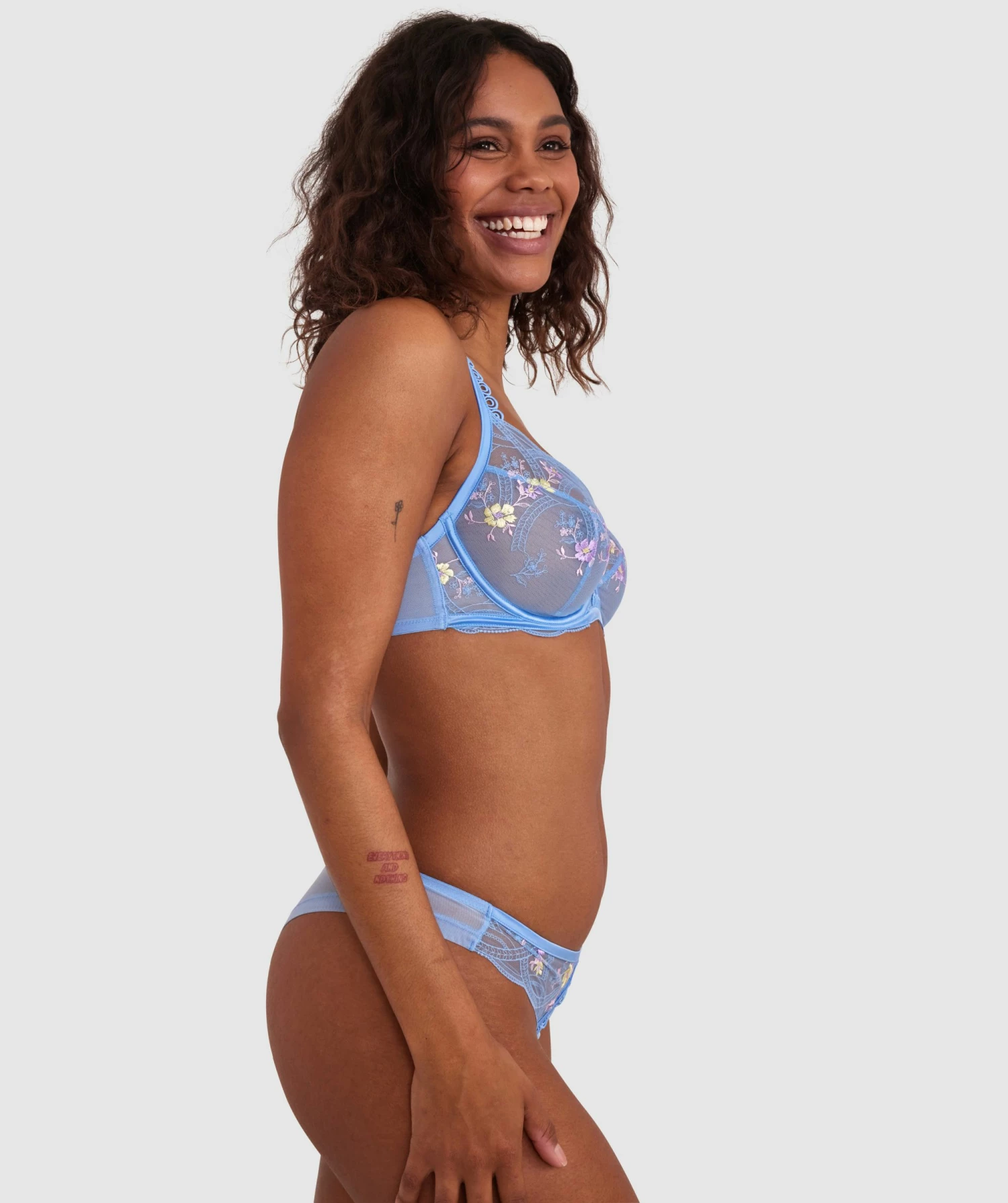 Made in a captivating sky blue, our Florentine Brazilian is adorned with delicate floral accents, celebrating the beauty of nature’s blooms. Revel in its seamless fusion of sophisticated style and ultimate comfort. Perfect for every occasion!