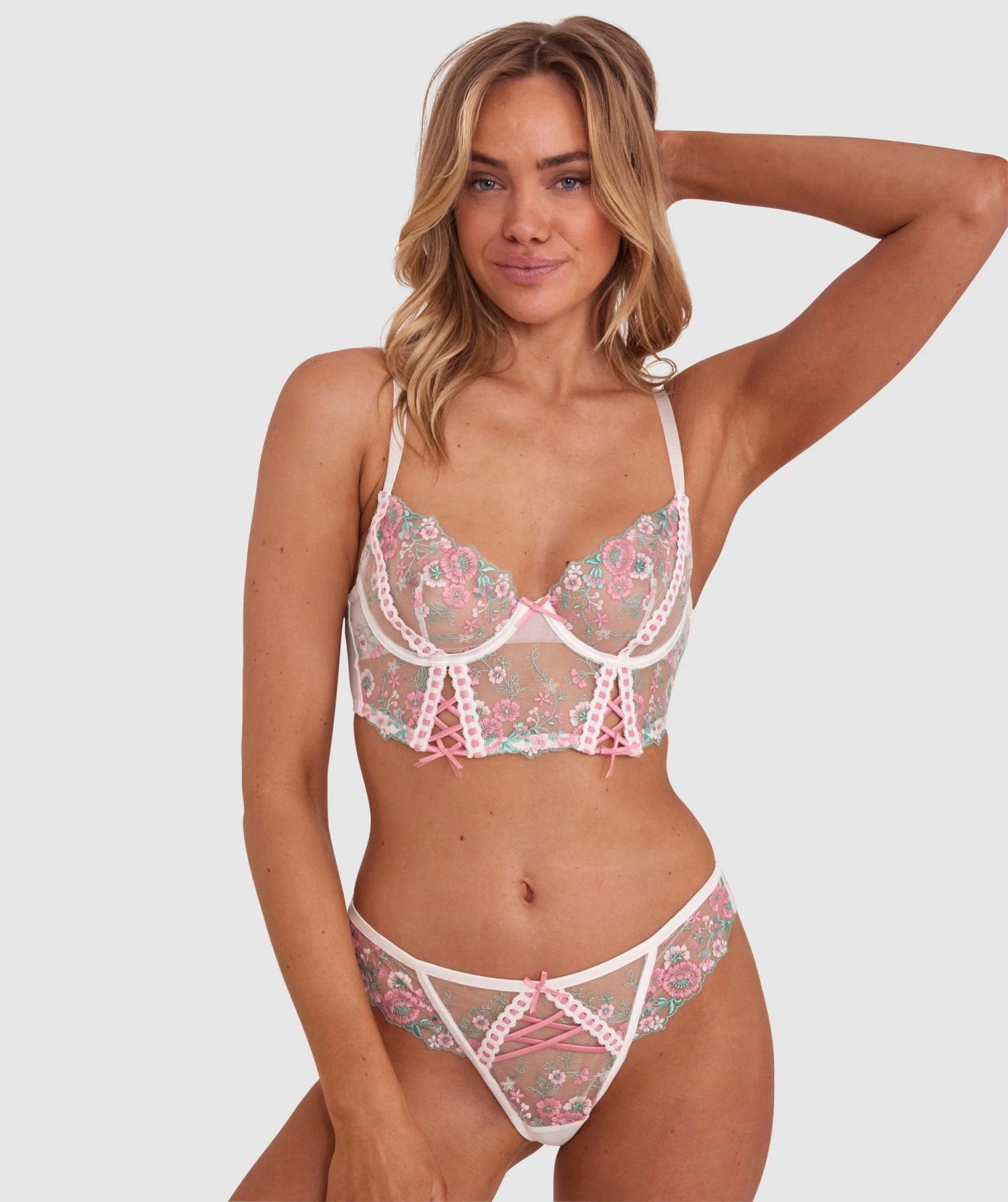 Put your eyes on our enchanting Secret Garden Underwire, designed to perk you up. Embrace elegance with sheer ivory mesh adorned by embroidered flowers, picot trims, and delicate pink ribbons. Experience frilly and flirty in every wear.