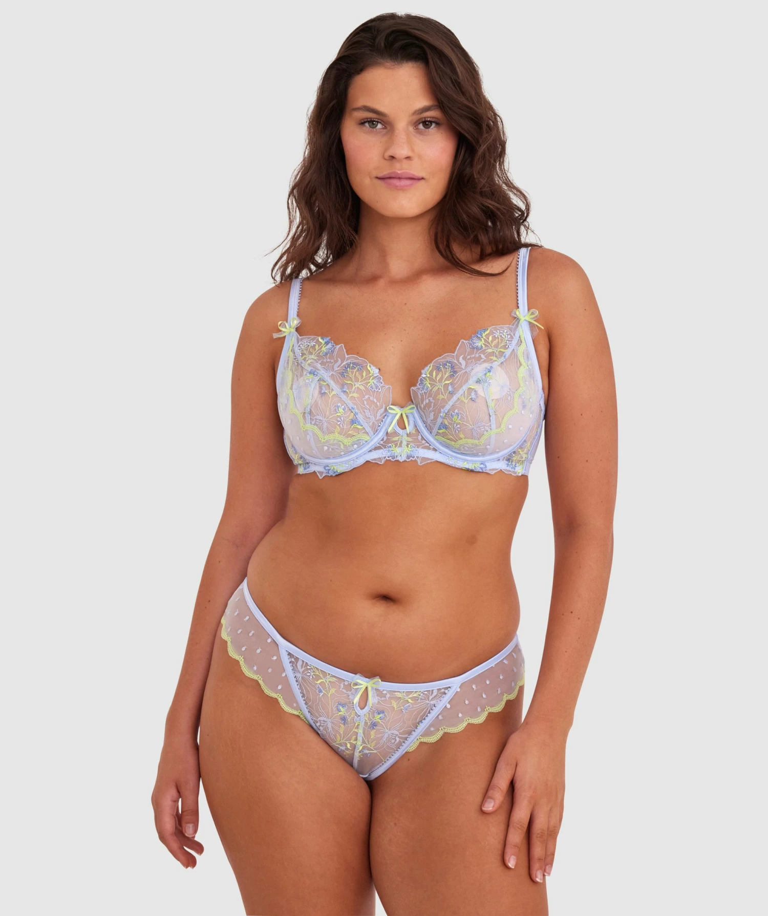 Meet our Still the One Underwire in baby blue. Mesh magic with embroidered blooms and playful yellow ribbons. Scalloped straps add the perfect twist. Dive into chic vibes-because your lingerie should be as unforgettable as you are!