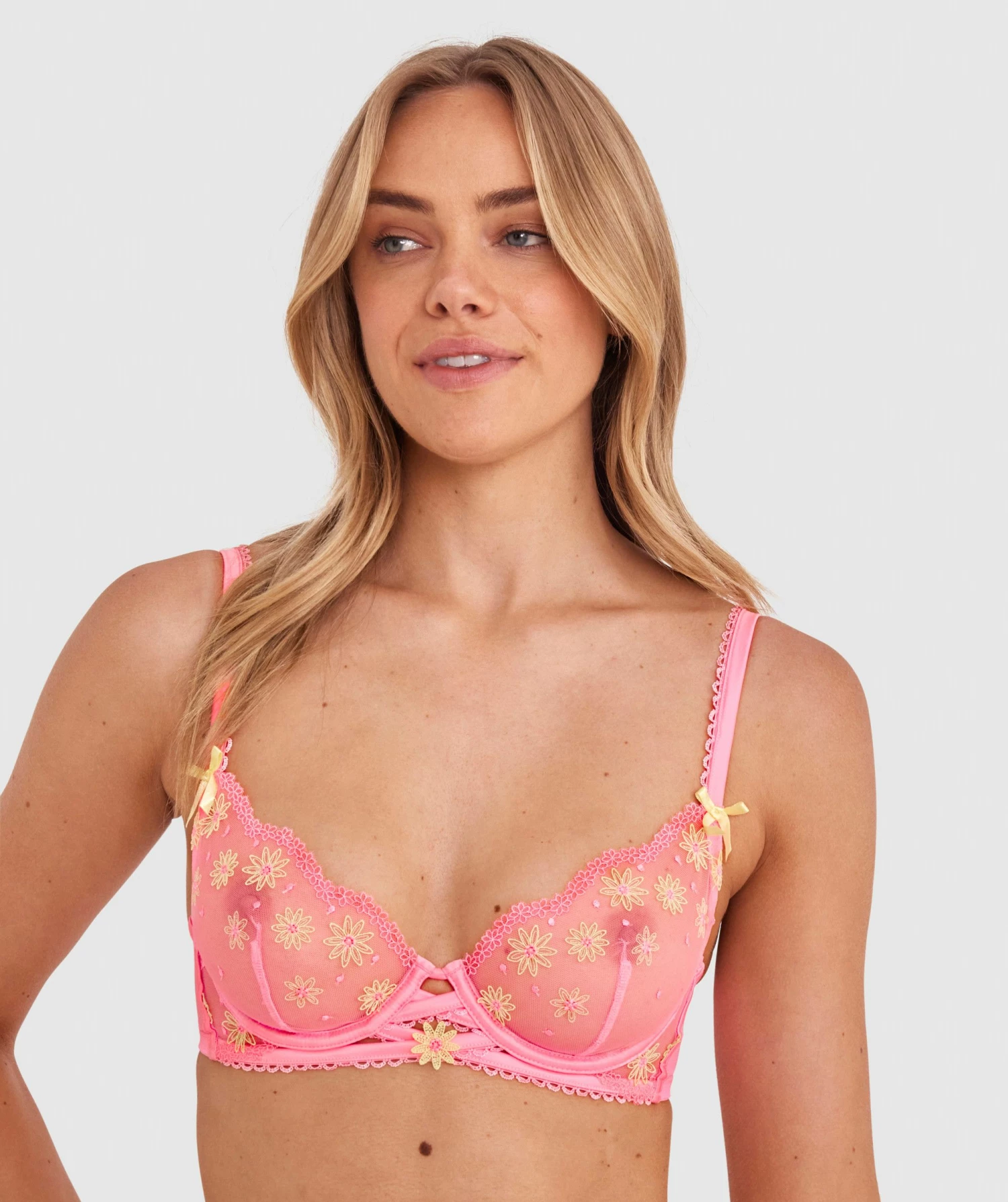 Indulge in our Sweet Like Candy Underwire Plunge Moira – a confection of sheer pink mesh adorned with pretty yellow daisies and ribbon accents. It’s a symphony of allure and playfulness. Embrace an irresistible charm that redefines your intimate style.