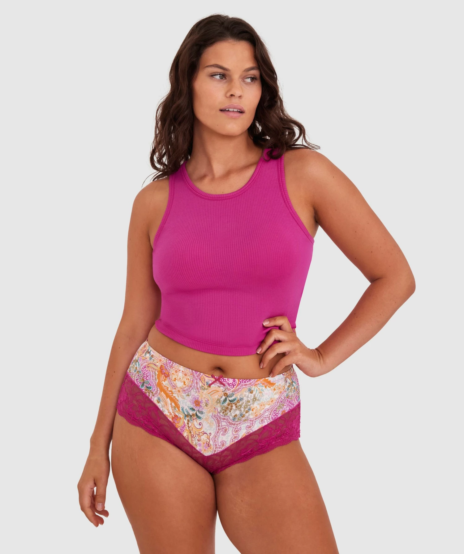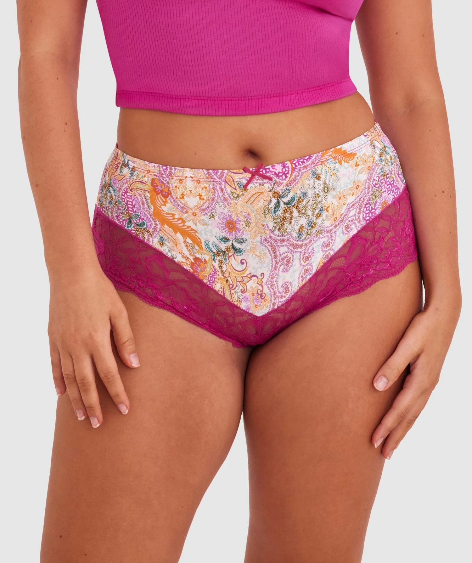 Experience full coverage in unparalleled style with our Faith Full Brief. A paisley printed panel meets delicate lace, crowned by a charming ribbon at the centre. Beauty meets comfort, creating an exquisite lingerie piece that redefines elegance.