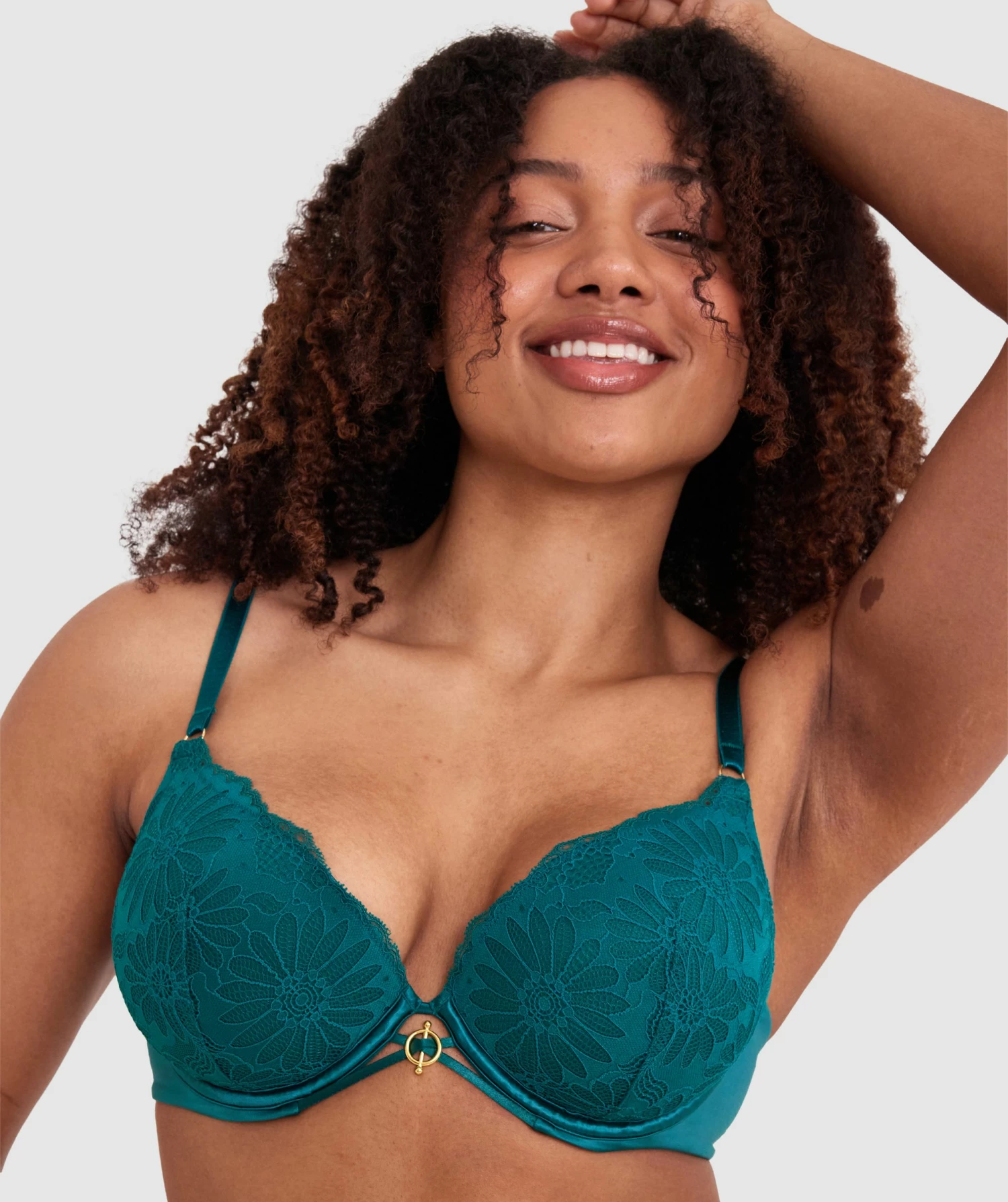 Discover bliss in both style and support, making every day a special occasion with our Florentine Contour Plunge. Crafted from a luxurious dark green fabric adorned with delicate floral patterns, this bra is a fusion of comfort and elegance.