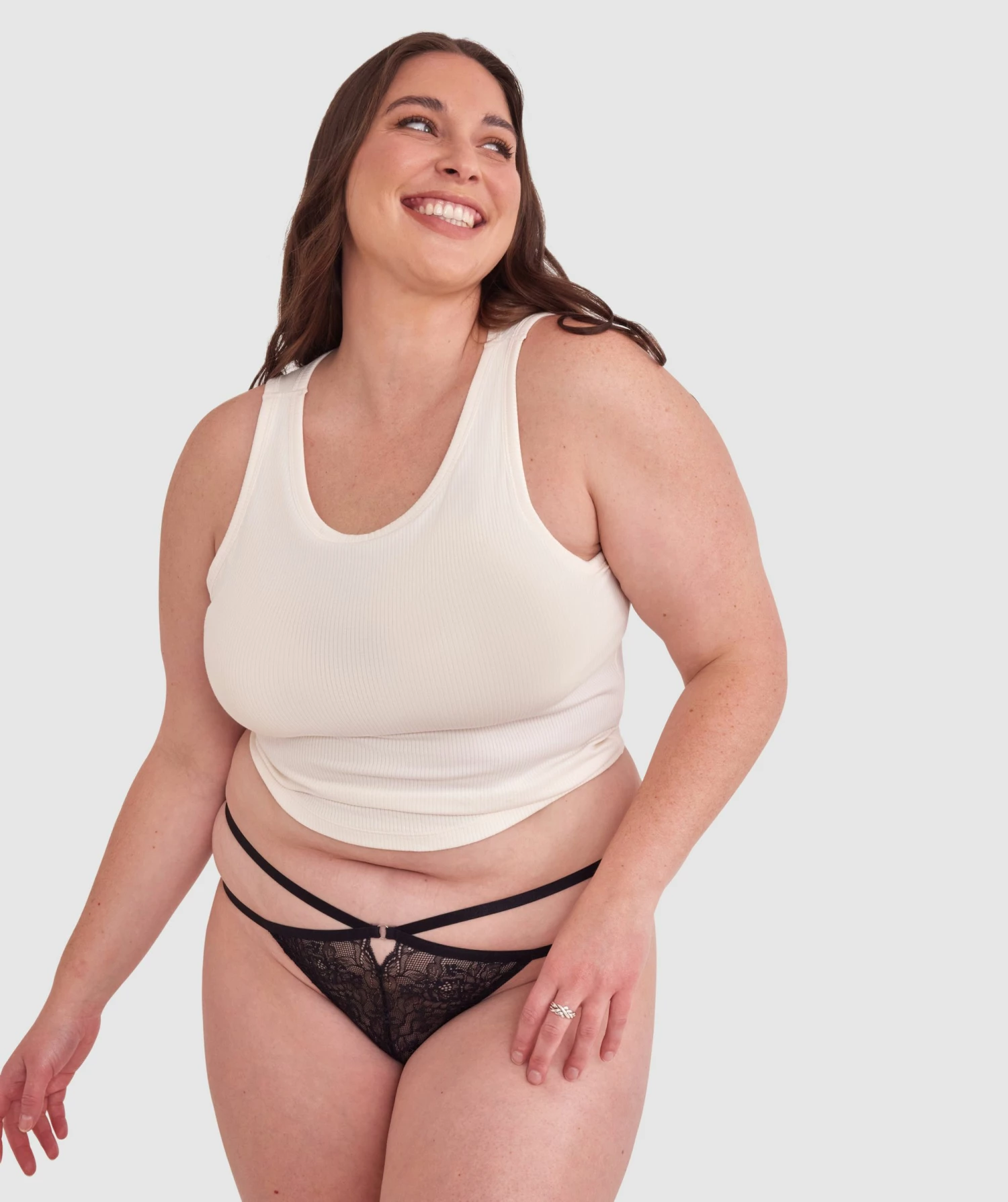 Introducing Lottie Tanga: the sassiest panty in town! Crafted from sleek black silk with a cheeky twist. Its double straps add a touch of edge, while lace panels up the ante on allure. From front to bum, embrace luxury and unleash your inner vixen!