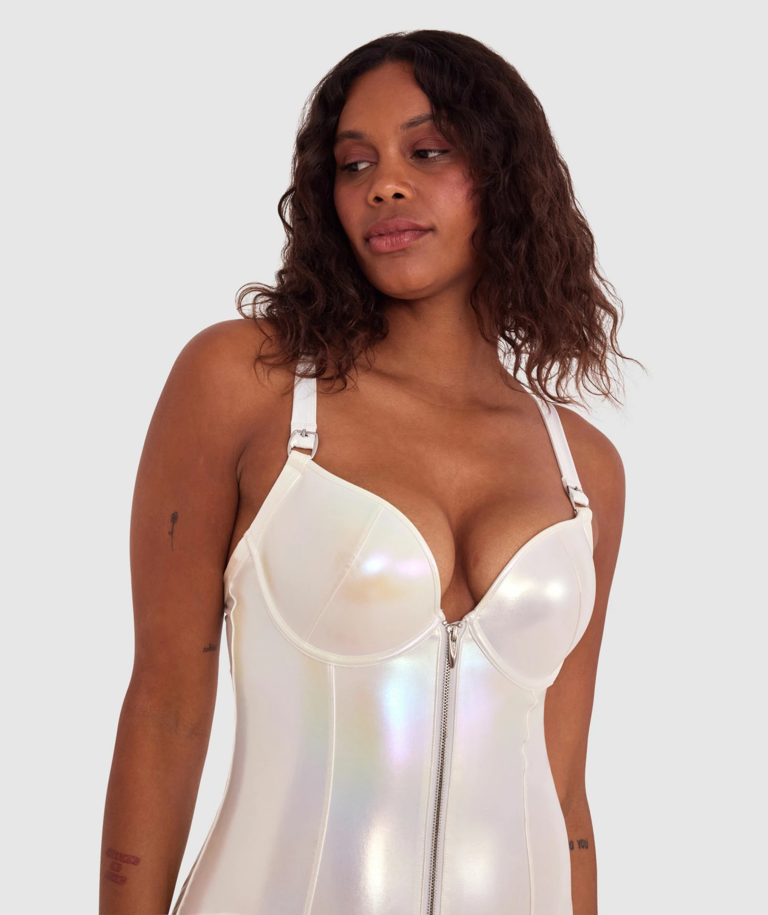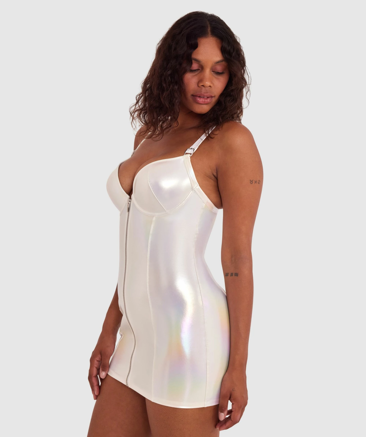 Savour our Sugar Rush Push Up Slip! Made from iridescent white fabric with bursts of colour, it’s a showstopper with a front zipper. This lets you transition seamlessly from intimate nights to sizzling club dance floors.