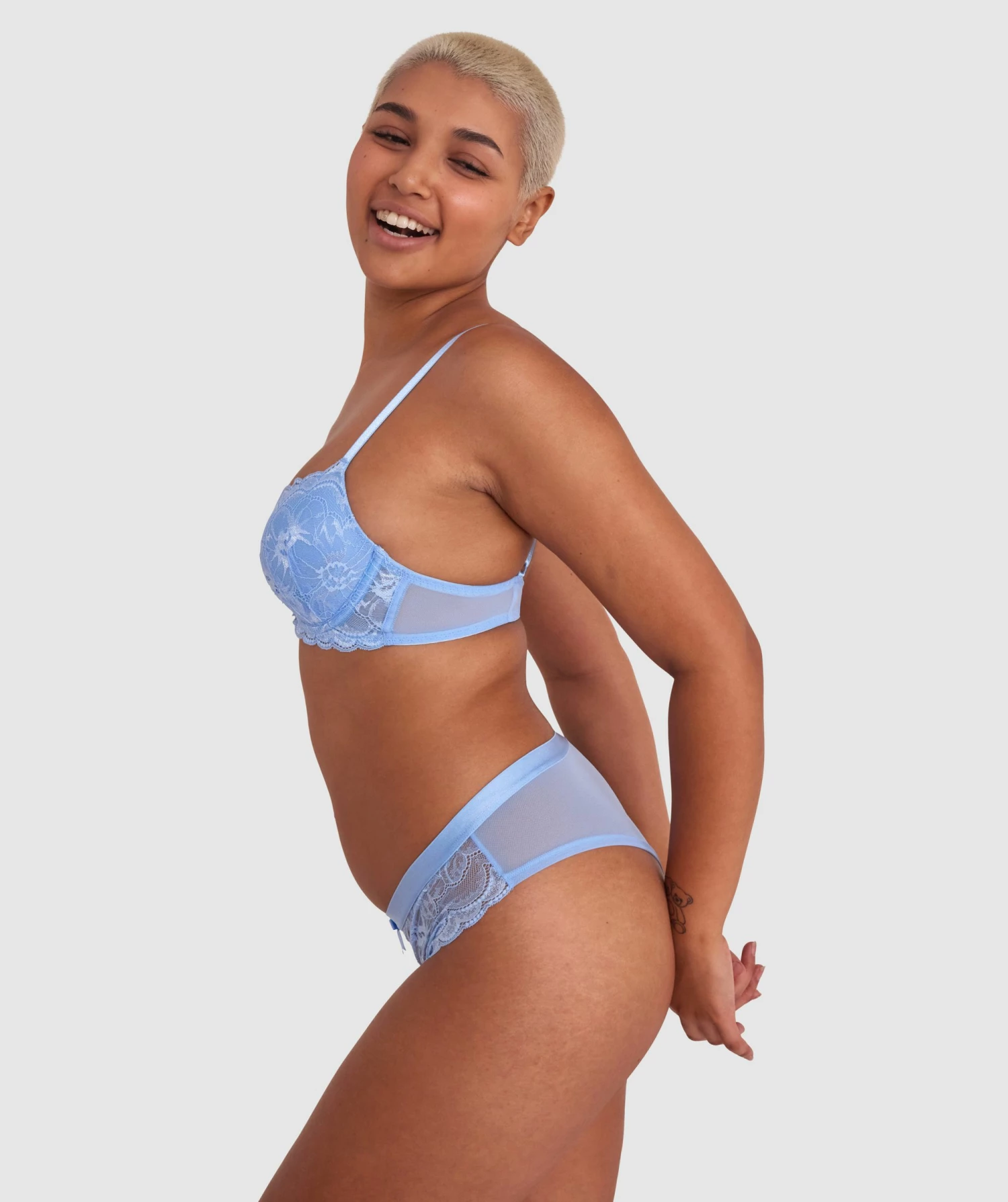 Experience the perfect blend of style and comfort with our Posie Push Up Bra in alluring light blue. Turn heads with its flirty and fun design. Scalloped edges add a touch of charm, while the dainty ribbon brings an extra dose of cuteness.