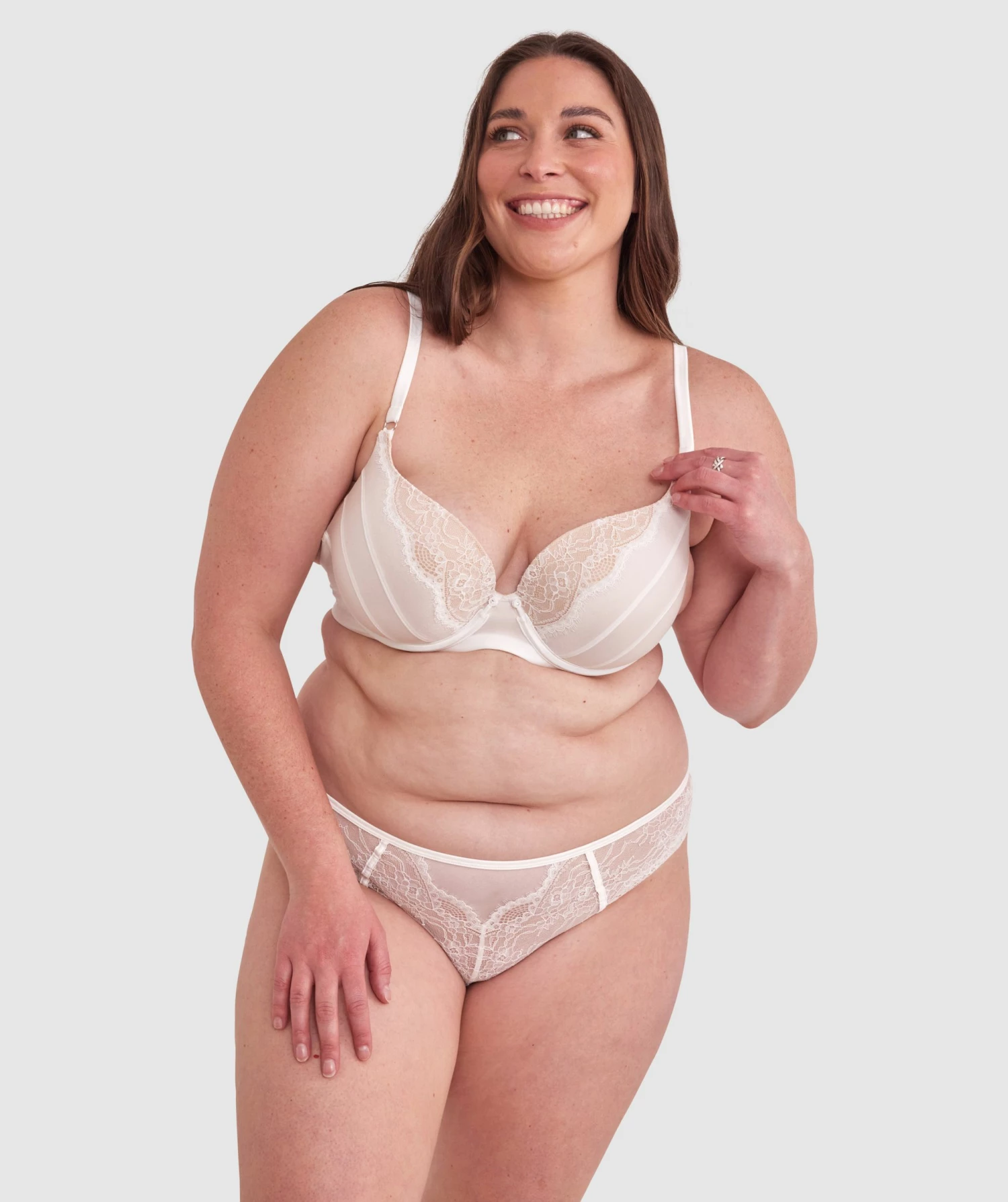Discover the future of lingerie and indulge in the freedom of choice like never before with our Removable Wire Contour Plunge Bra. Made with captivating ivory lace, this is a true design innovation with its removable wires, combining elegance and versatility in one piece.