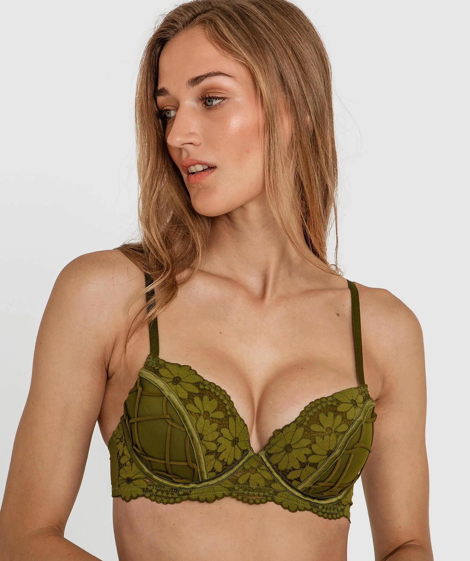 Set the mood for romance with our alluring Saskia Pushup Level One Demi Hope bra in a unique khaki hue. It’s comfy enough for everyday wear but retains a flirt factor for the bedroom. Complete the look with our matching cheeky mini V.