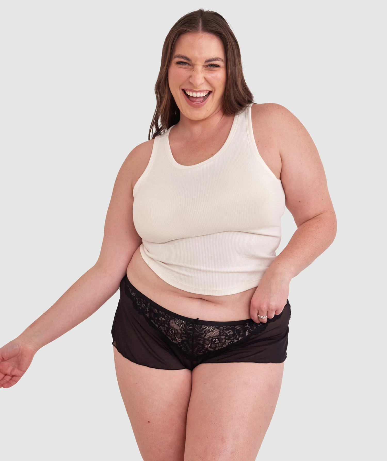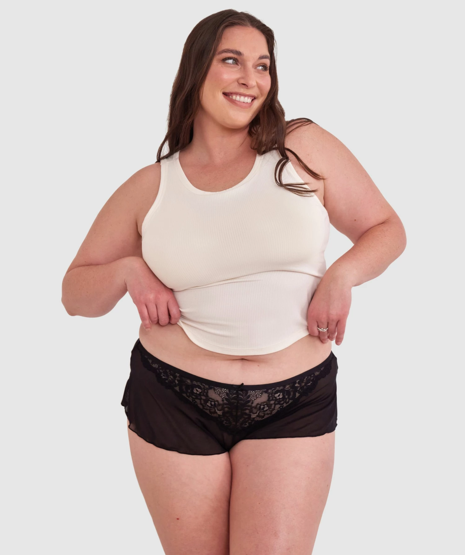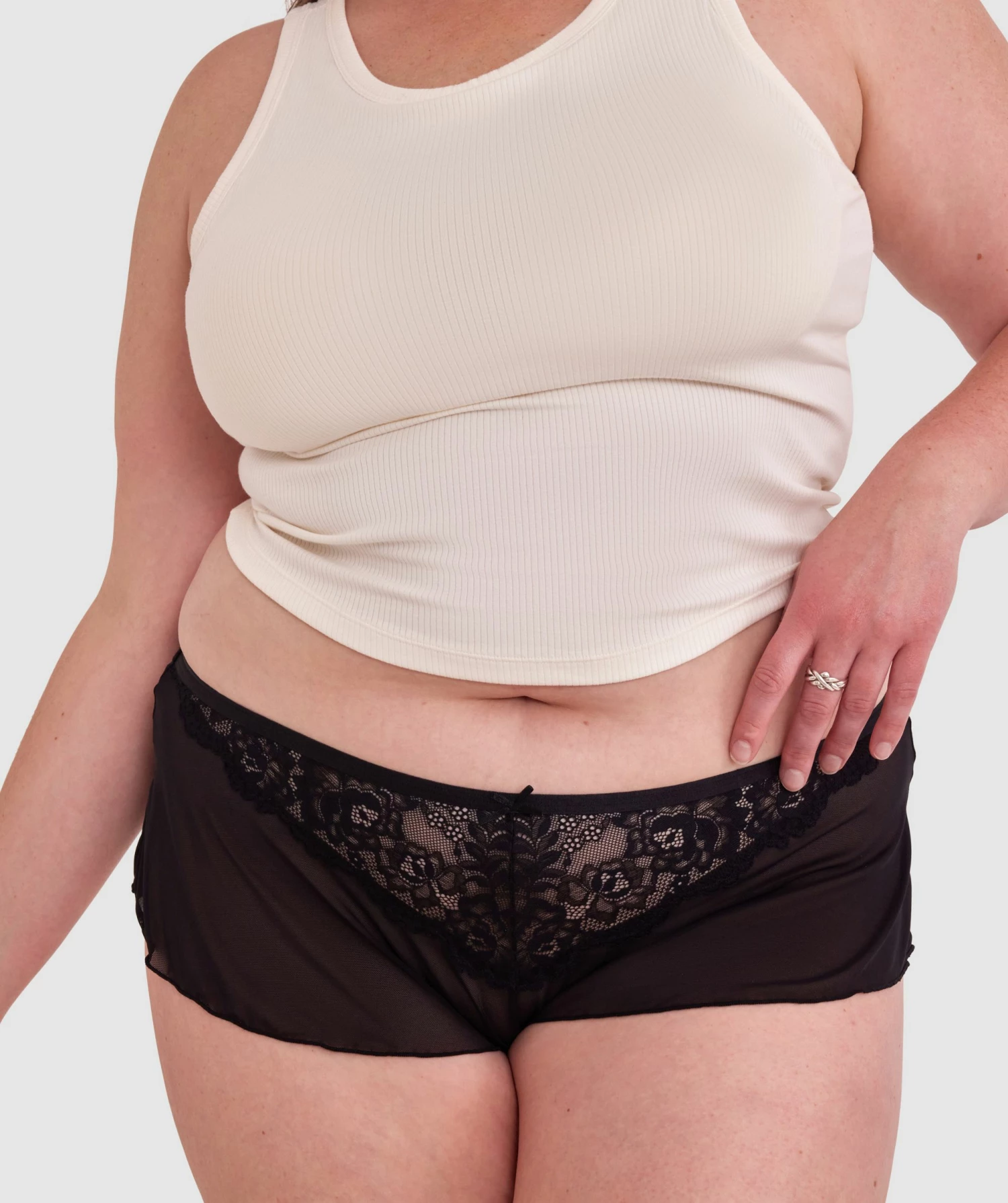 Enjoy the perfect blend of girlish charm and sheer seduction with our Suzie French Knickers in black! Crafted mostly out of sheer, flowy mesh, these knickers elegantly skim your curves. The front lace V panel adds a delightfully playful touch.