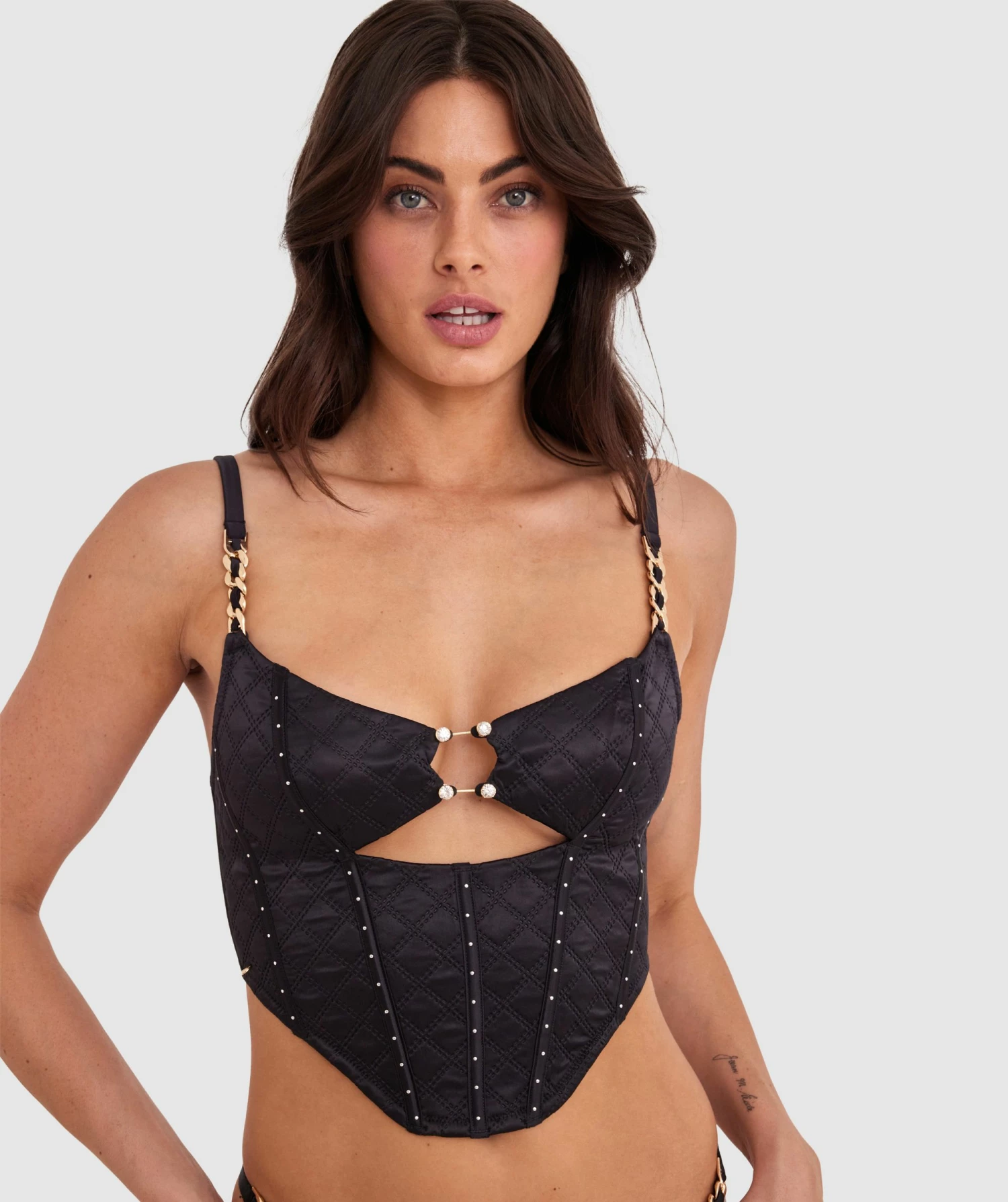 Ignite your fire with our Miami Heat Corset in seductive black quilted material. This bold top features metal studs and chains for a striking contrast, while the cut-outs add an irresistible flirt factor. It’s the perfect piece for making a statement.