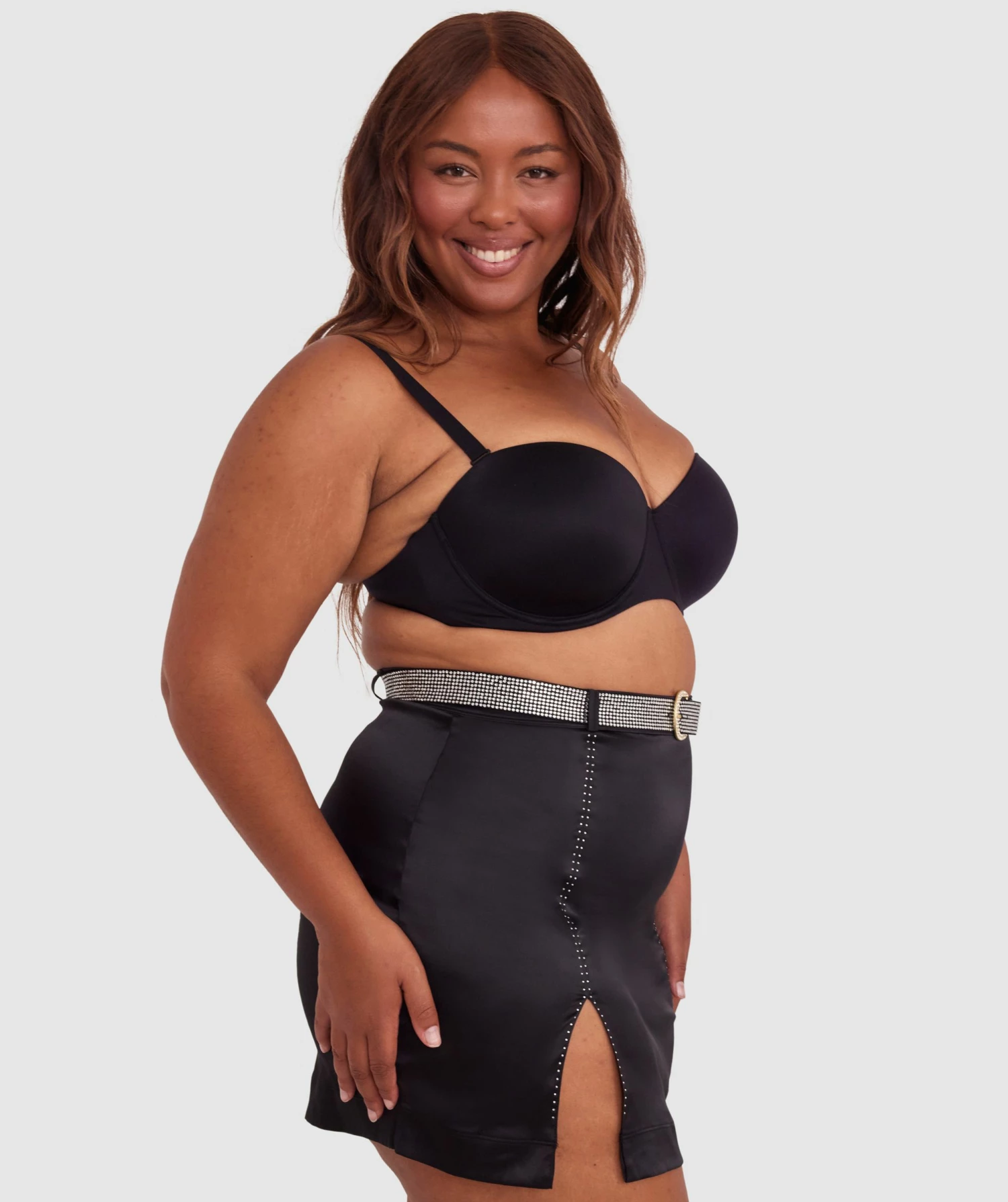Dare to dazzle and embrace a fun night in our exquisite Relentless Mini Skirt. Made with shimmery black fabric that hugs your delicious curves. Sparkling diamantes on the seam, paired with a matching belt, ensure you shine with every step you take.